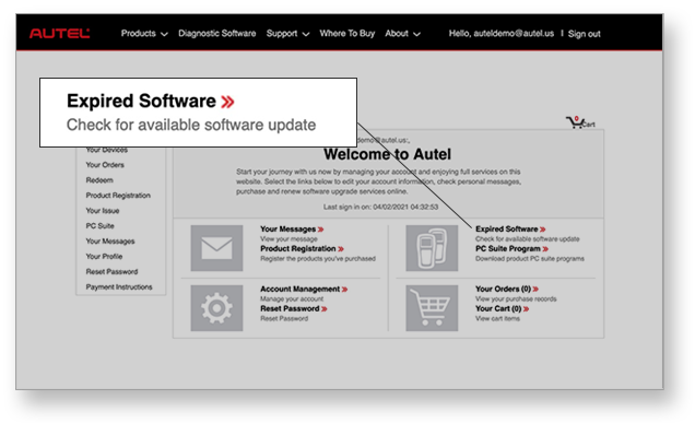 Visit pro.autel.com and sign in with your Autel ID. Click the "Expired Software" link to identify which of your tools needs a software update.